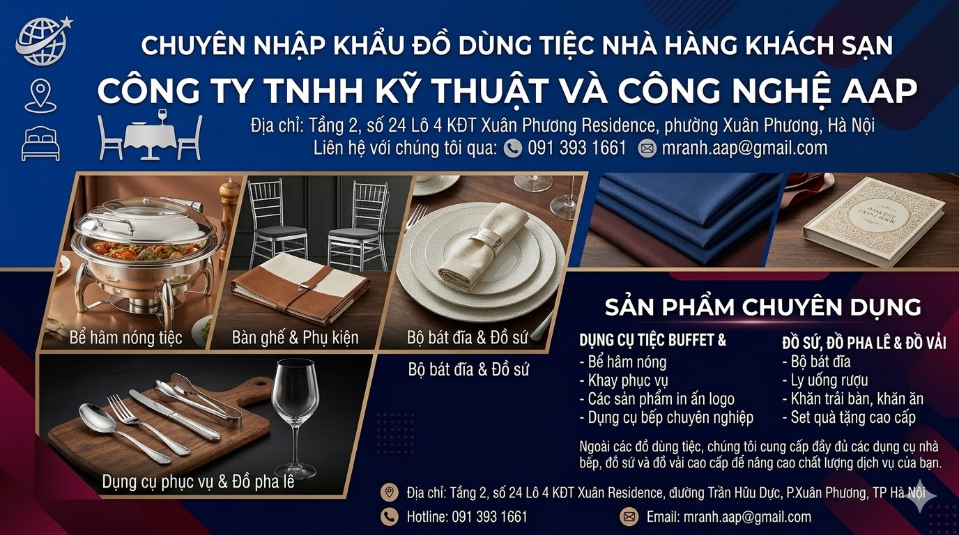 Nếu bạn đang tìm kiếm một đối tác tin cậy để cung cấp đồ dùng tiệc nhà hàng khách sạn, hãy liên hệ với Công ty TNHH Kỹ Thuật và Công Nghệ AAP ngay hôm nay để được tư vấn và hỗ trợ tốt nhất.